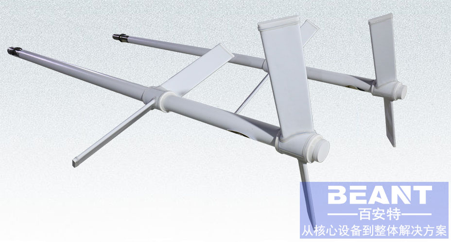2、旋槳式攪拌器由2~3片推進式螺旋槳葉構成,工作轉速較高,葉片外緣的圓周速度一般為5~15m/s。旋槳式襯四氟攪拌主要造成軸向液流,產生較大的循環量,適用于攪拌低粘度(<2Pa·s)液體、乳濁液及固體微粒含量低于10%的懸浮液。攪拌器的轉軸也可水平或斜向插入槽內,此時液流的循環回路不對稱,可增加湍動,防止液面凹陷。